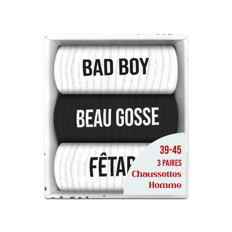 Un coffret de chaussettes homme qui cartonne, alliant utilité et humour.Le coffret trio chaussettes homme noires & blanches est le cadeau parfait pour faire rire, surprendre et faire plaisir en même temps... Correspondant à toutes les personnalités, ces chaussettes basiques en apparence sont en fait drôles, impertinentes, assumées et pleines de second degré ! Bref, c'est un cadeau parfait pour les hommes qui aiment rire, provoquer ou simplement ne pas se prendre au sérieux !