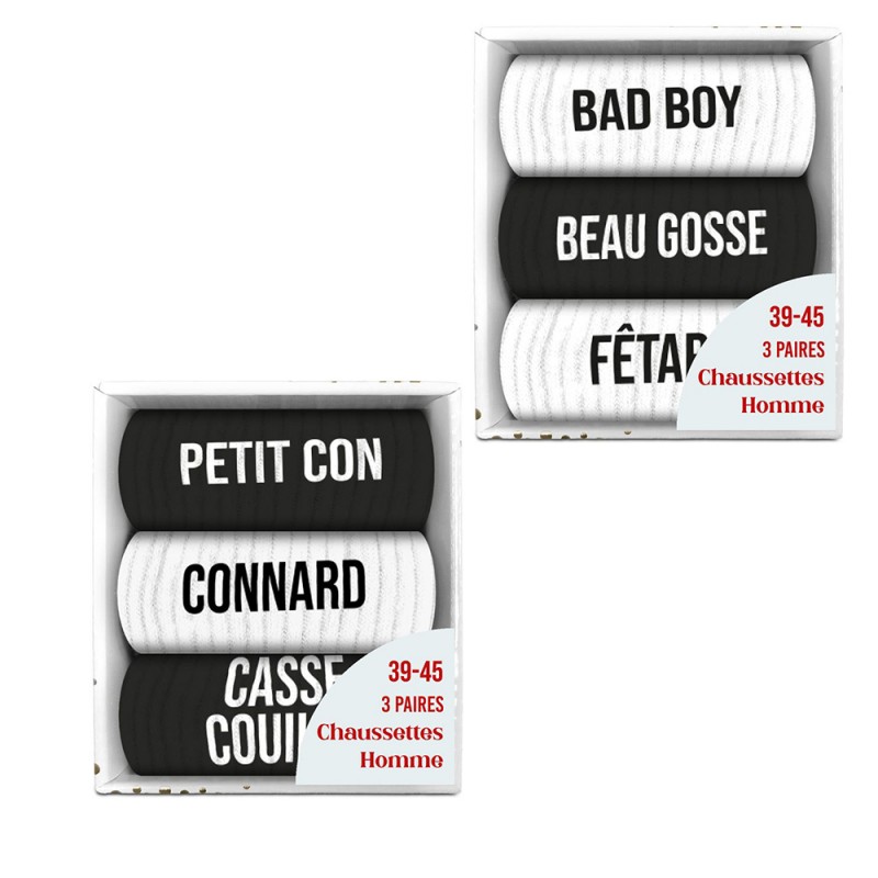 Plusieurs modèles de chaussettes au choix – une personnalité par paire.Choisissez le coffret de chaussettes insolites qui correspond le mieux à l’homme à qui il est destiné : bad boy/beau gosse/fêtard, petit con/connard/casse-couille, beau gosse/insolent/irrésistible, cool/baroudeur/sportif ou relou/boulet/petit con. Un coffret = 3 humeurs, 3 messages, 3 paires de chaussettes pleines de caractère !