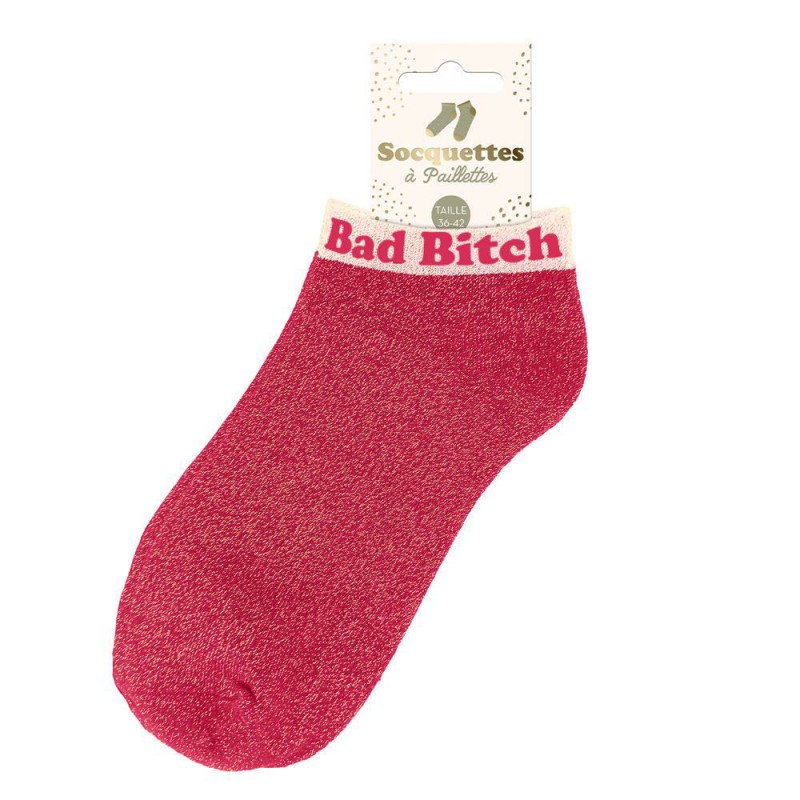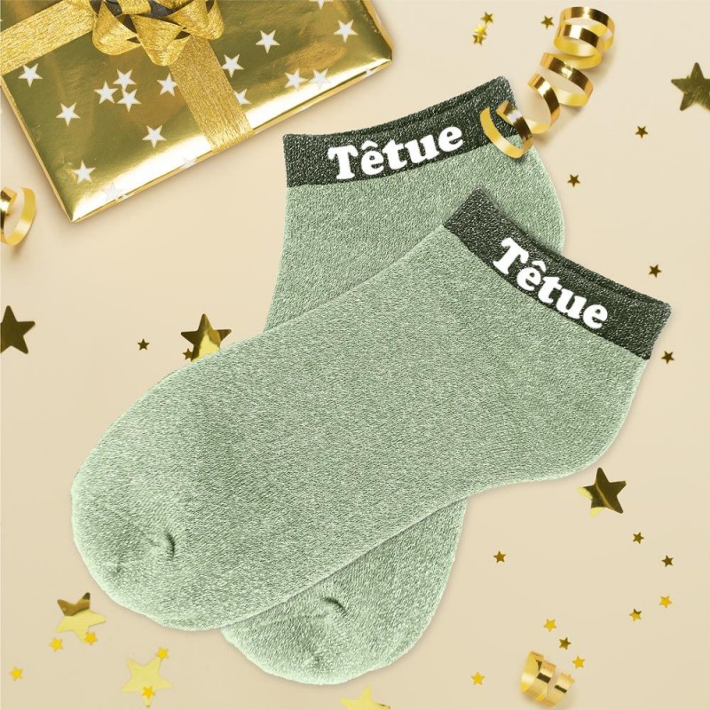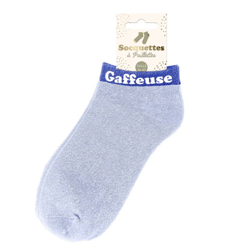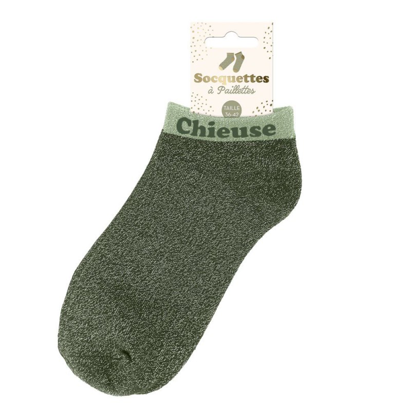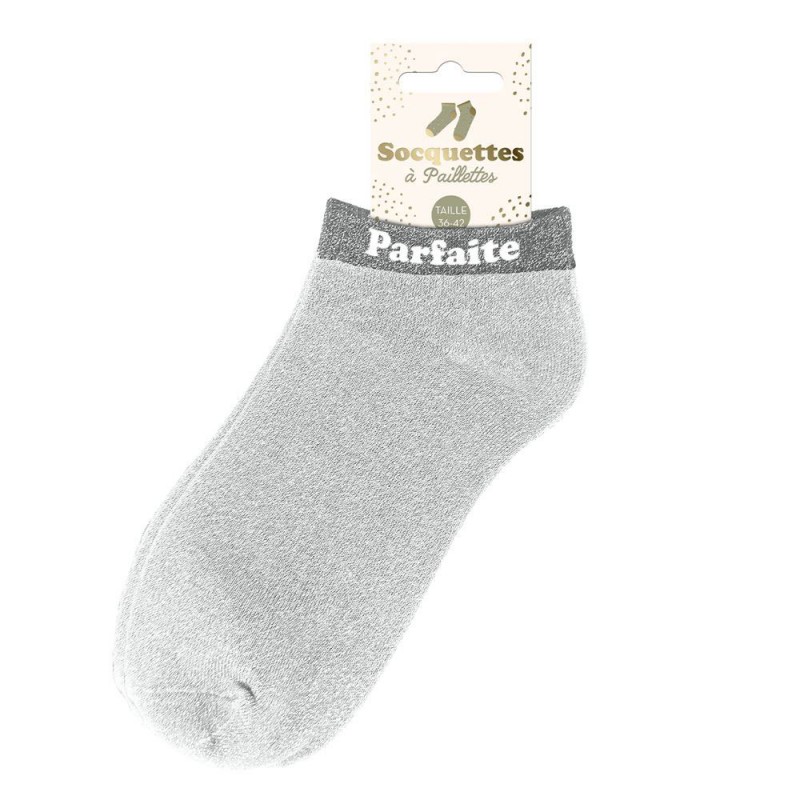 Des socquettes pailletées avec mot fantaisie et au look tendance et moderne.Chaque paire de socquettes colorées raconte une petite histoire et apporte du caractère à votre look avec ce mot fantaisie intégré qui ajoutera une touche fun et originale... Chipie, princesse, têtue, irrésistible, pipelette, diva, rebelle, kiffante, connasse, amore, parfaite ou encore relou, choisissez l'inscription parfaite pour faire plaisir à une femme de votre entourage !
