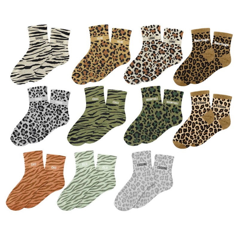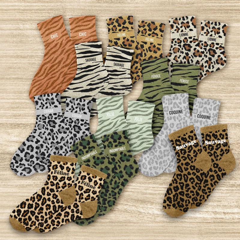 Différents modèles pour chaque humeur et chaque style.Exprimez-vous librement grâce à un large choix de modèles de chaussettes pailletées colorées... Leur pelage est différent pour chaque paire de chaussettes, mais également leur petit mot irrésistible affiché. Opterez-vous pour la chaussette coquine, jolie, chic, féline, lionne, sauvage, indomptable, féroce, cougar, léopard féline ou encore léopard sauvage ?