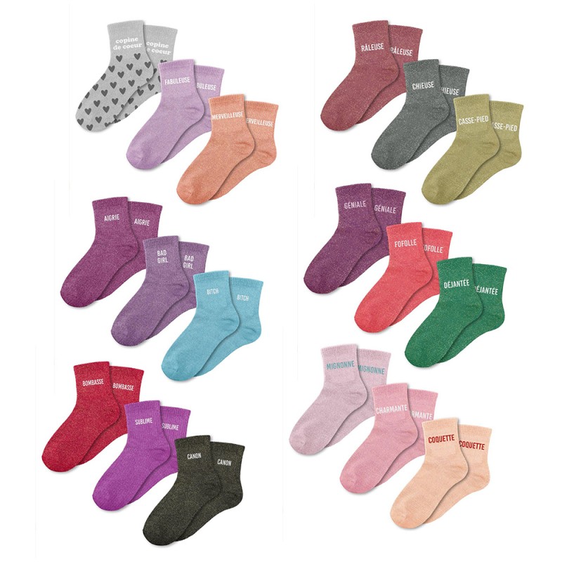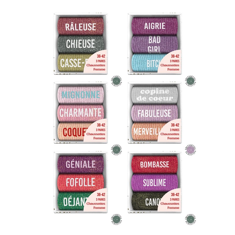 Ce trio de chaussettes paillettes fantaisie pour femme est le cadeau idéal pour celles qui aiment allier style et second degré... Chaque boîte contient trois paires de chaussettes pailletées aux messages amusants et décalés ! Du ton affectueux au plus audacieux, ces jolies chaussettes reflètent une personnalité unique et apportent une touche d’originalité à toutes les tenues. Conçues pour unir confort et éclat, elles sont disponibles en plusieurs modèles afin de s’adapter à chaque femme et à chaque humeur...