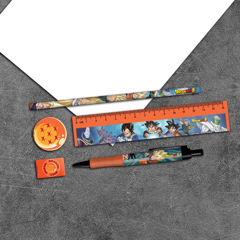 Vous allez être content de tomber sur ce mini set de papeterie sous licence officielle Dragon Ball Z ! Gomme, règle, stylo, crayon et taille-crayon vont ravir l'otaku que vous êtes pour une trousse complète pour vous rendre à l’école ou au bureau.