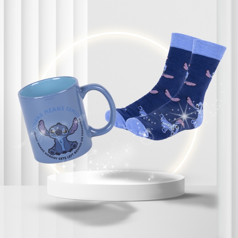 Set Stitch Disney avec une tasse et une paire de chaussettes.