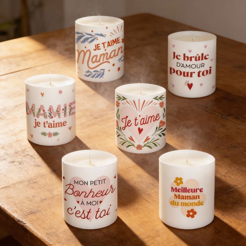 Une bougie décorative qui allie charme et émotion ! Son pot met en valeur la lueur douce de la flamme, créant une ambiance apaisante et romantique... L’inscription "Je t’aime", "je t'aime maman", "meilleure maman du monde" ou "mamie je t'aime" ajoute une touche sentimentale qui en fait un objet symbolique et intemporel. Son design épuré lui permet de s’intégrer harmonieusement à tout type de décoration, du plus classique au plus moderne...